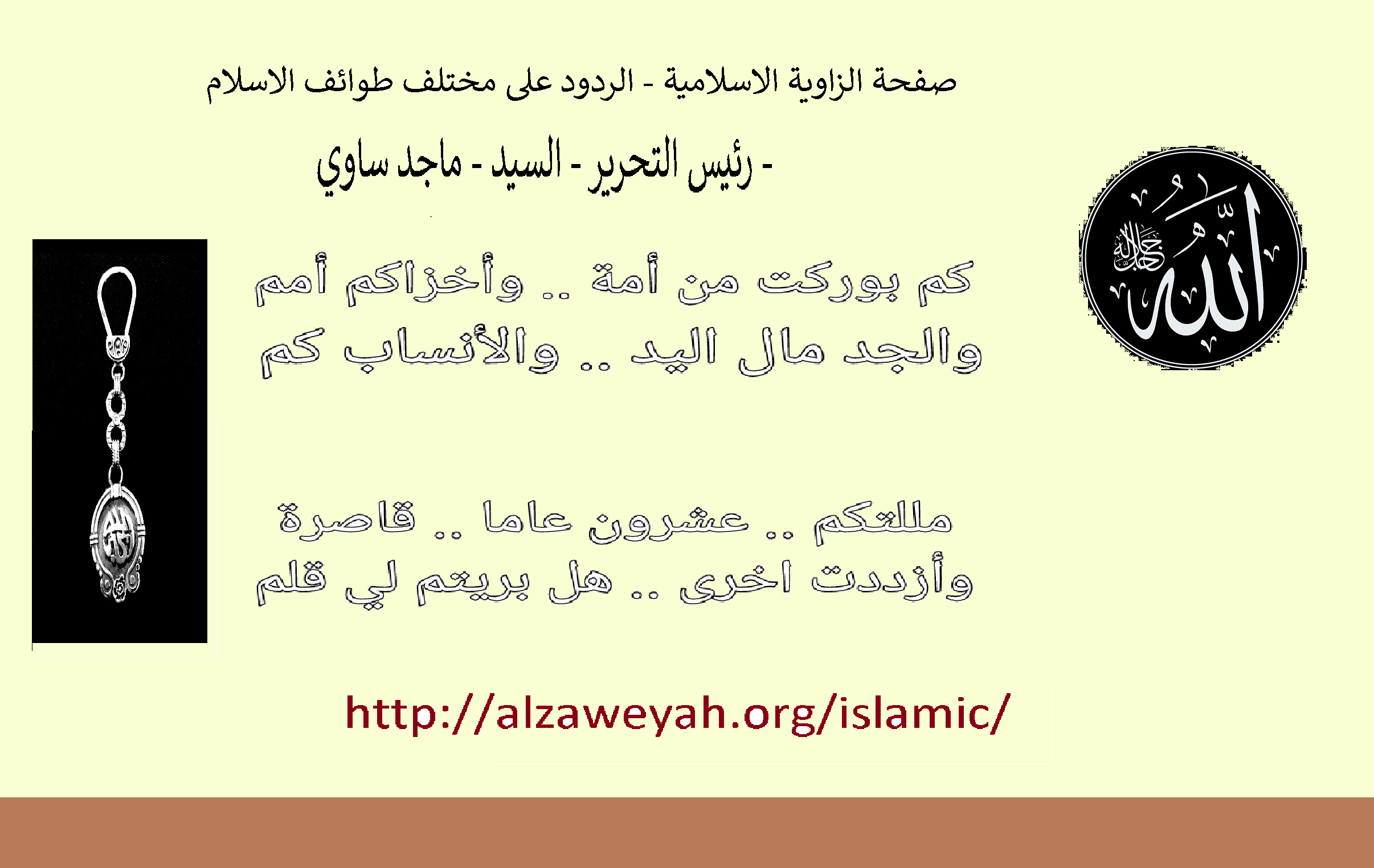 تنويه نافع من رئيس التحريرانا لا اتحمل اي فهم سقيم لاي مادة من مواد الصفحة , وكون الصفحة متعلقة بالموضوع الديني الاسلامي لا يعني انني هنا انصب نفسي مفتيا - معاذ الله - وانما هو مما اعلمه والادلة عندي عليه موجودة عند الطلب ممن يرغب بالاستفاضة مما هو منشور هنا , والامة ولله الحمد فيها الكثير من القامات العلمية فعلى من اشكل عليه امر مما نشر هنا الرجوع اليهم والله الموفق والهادي لسواء السبيل.ماجد ساوي